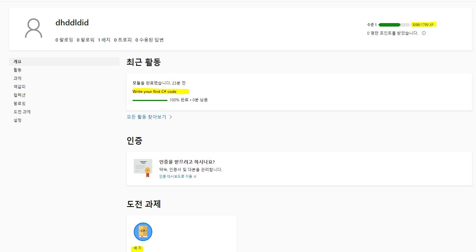 과제를 완료 하면 아래와같이 "최근 활동", "인증", "도전 과제" 목록 들이 있고, 어느것을 완료 했는지, 또한 해당하는 배지 + 경험치들도 있다.