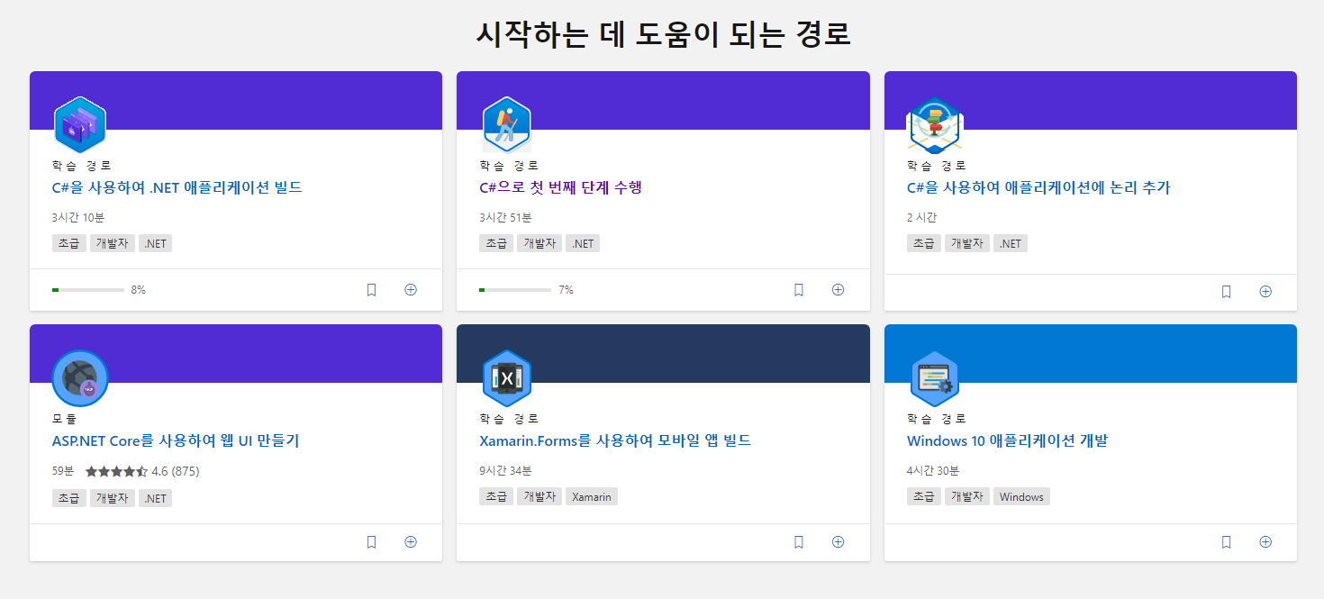 .NET 을 누르고 들어오면 이렇게 경로를 추천 해 준다. 배우고자 하는 메뉴에 들어가서 가이드에 맞춰서 진행해 보자.