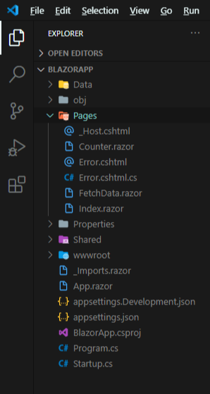 Program.cs서버를 시작하는 앱의 진입 점입니다.Startup.cs앱 서비스와 미들웨어를 구성하는 곳입니다.App.razor앱의 루트 구성 요소입니다.BlazorApp/Pages디렉토리는 응용 프로그램에 대한 몇 가지 예를 들어 웹 페이지가 포함되어 있습니다.BlazorApp.csproj앱 프로젝트 및 해당 종속성을 정의합니다
