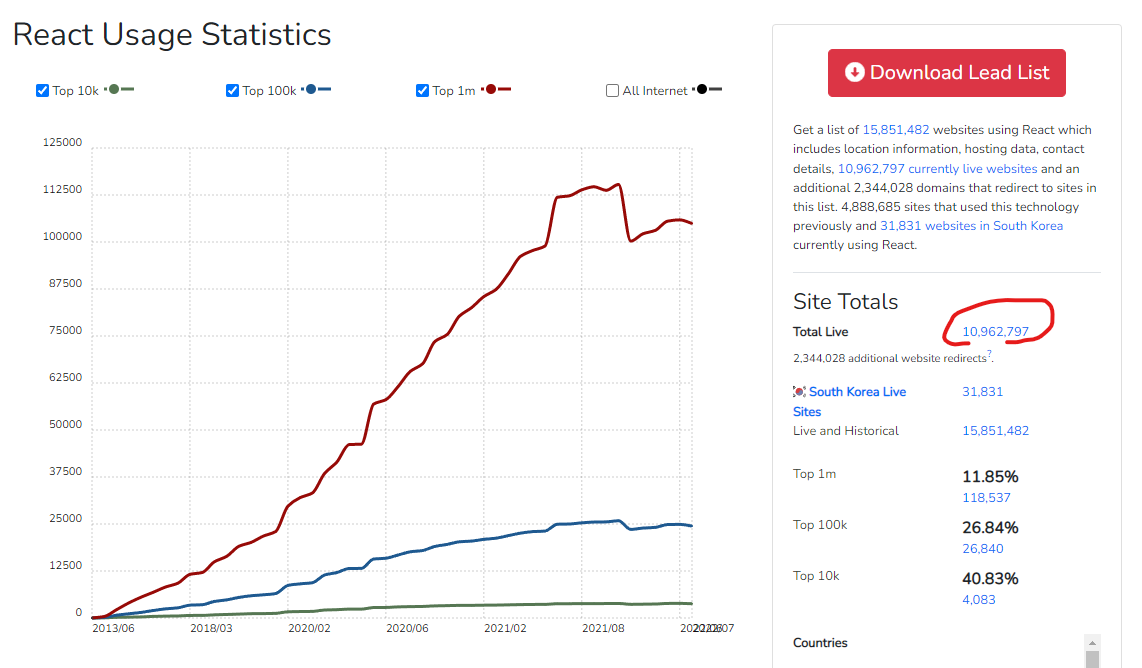 리액트 규모는 아래와 같이 찾아 볼 수 있다